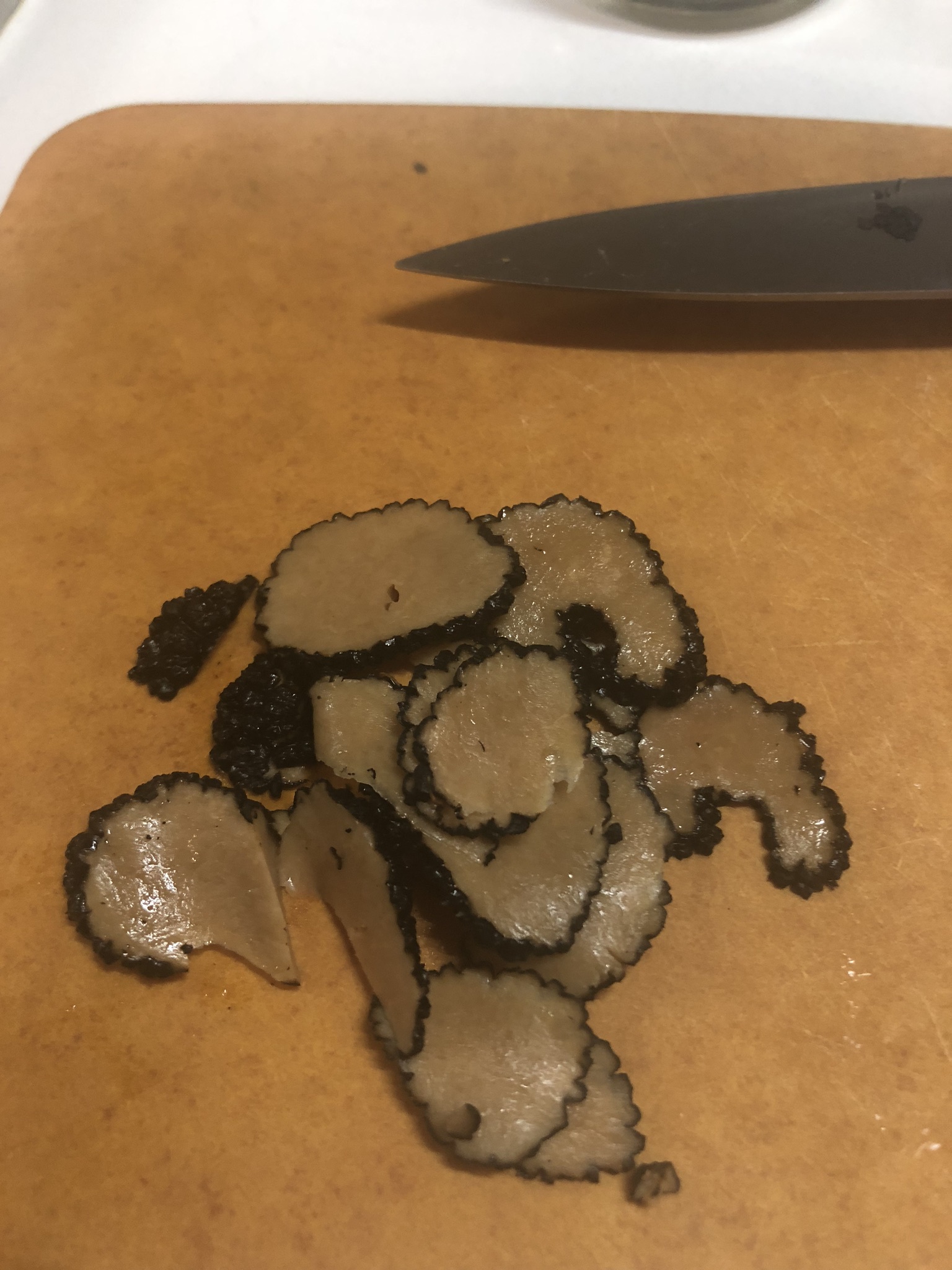 5) 把雞斬件上碟,再淋上少許黑松露油黑松片