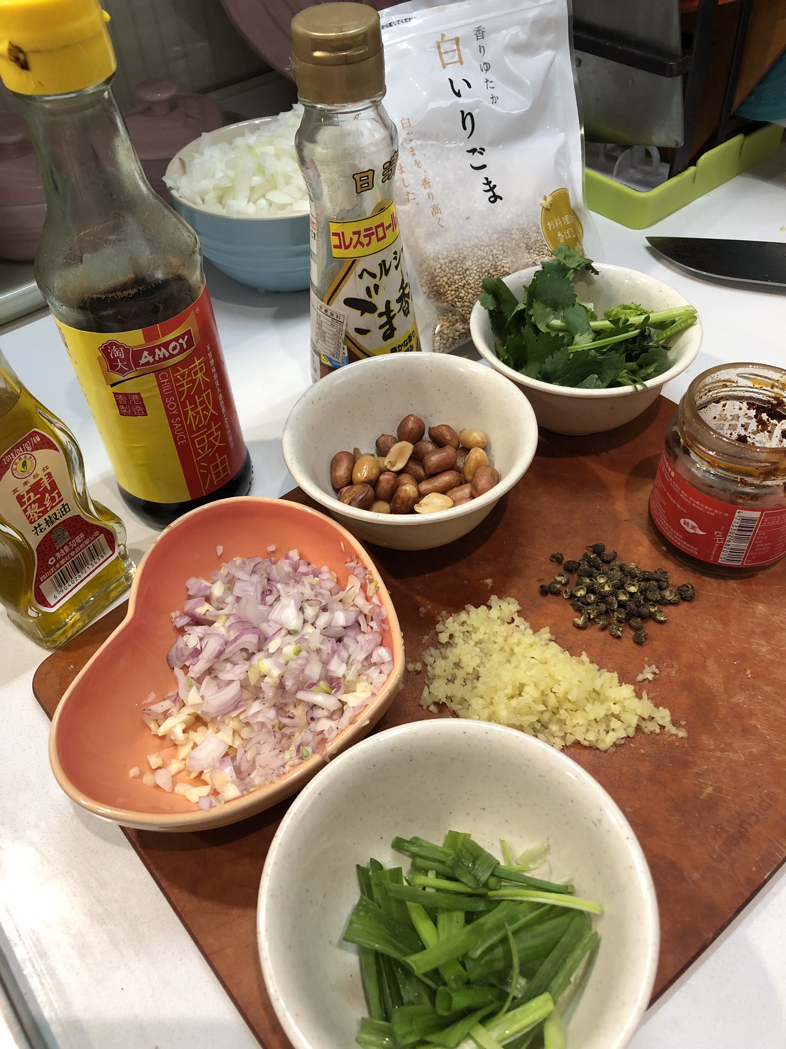 乾蔥,指天椒微浸一下,再下其他麻辣汁材料拌勻試味, 麻和辣的程度可依個人口味增減, 麻辣醬淋上雞上