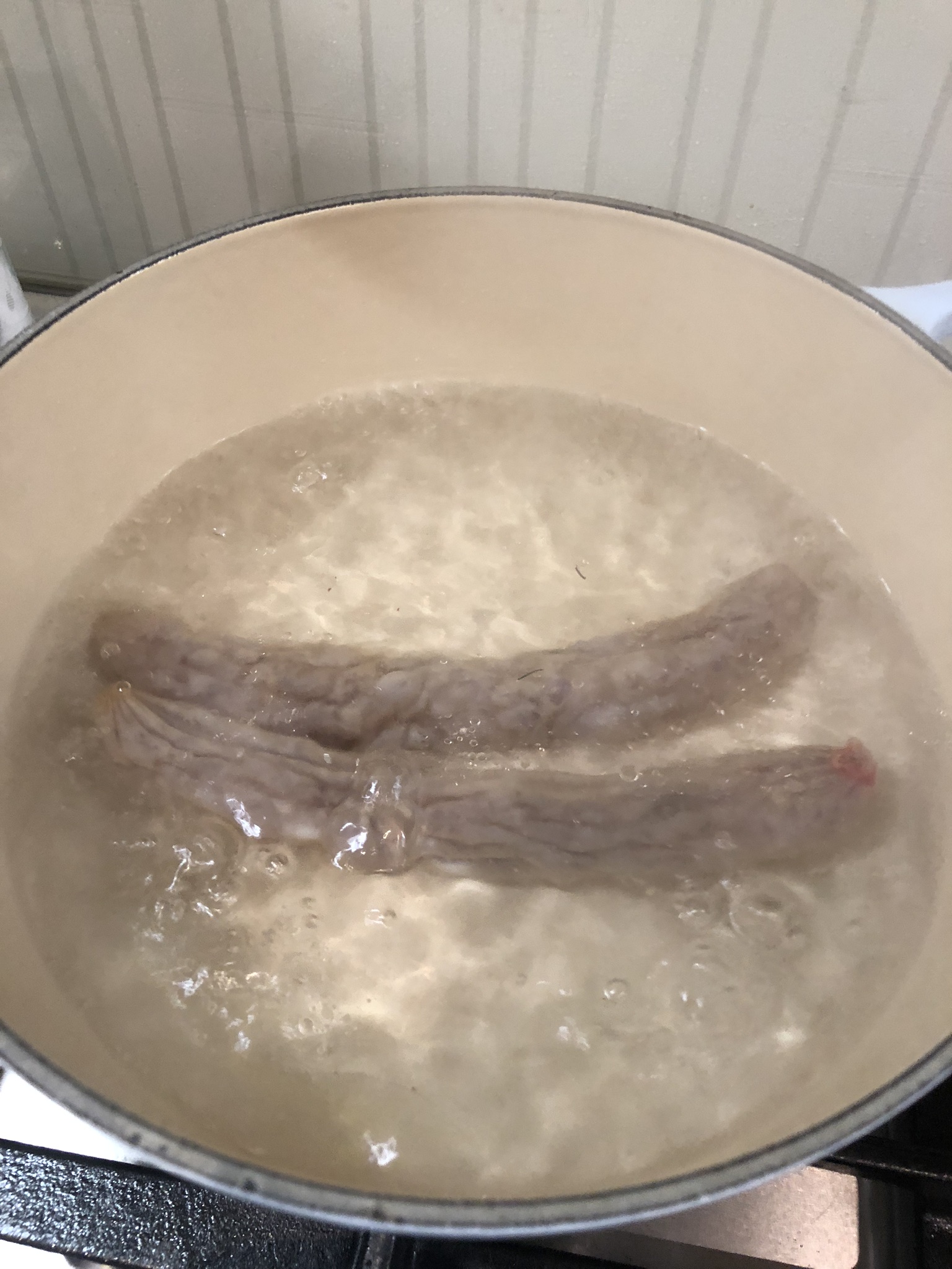 4) 蘿蔔刨皮切粗條,滾水灼蘿蔔5分鐘可去腥味和存放耐一點,倒去水後備用