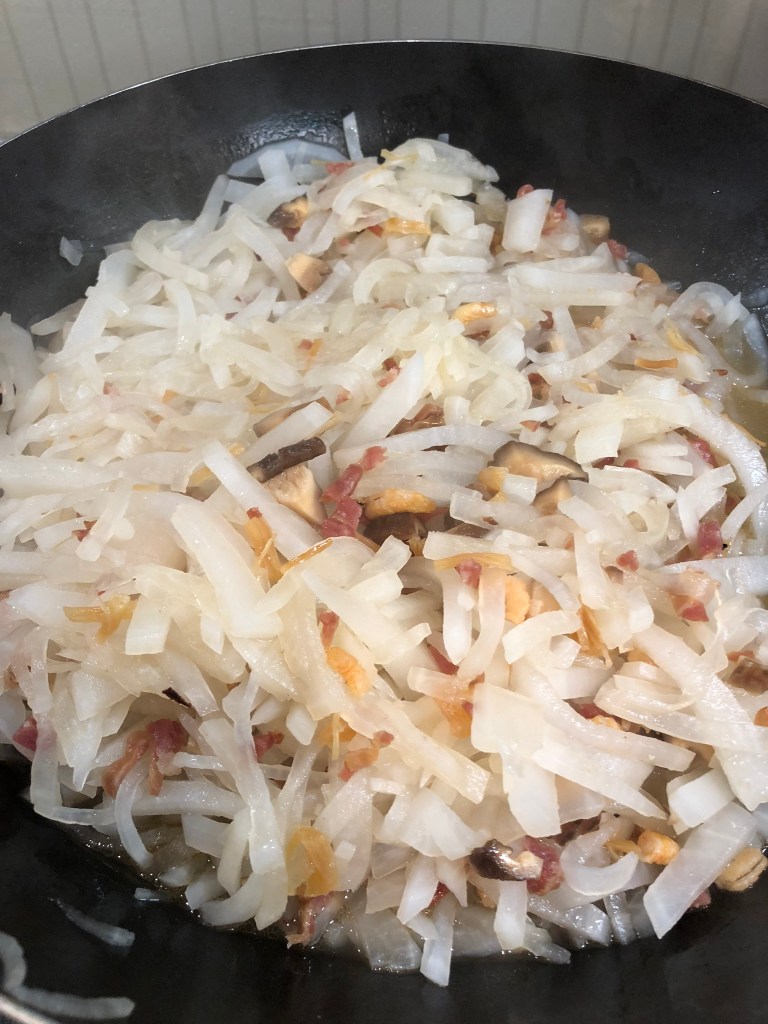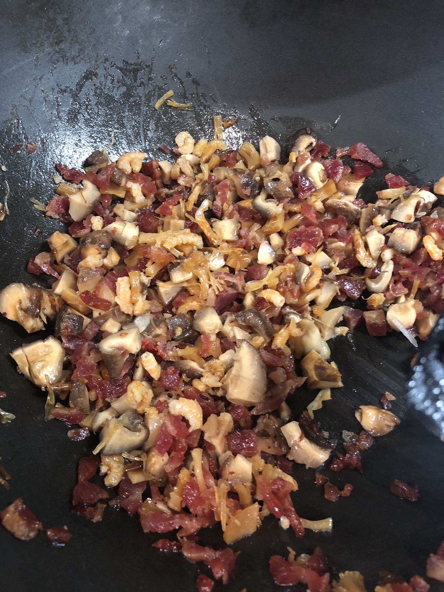 5) 爆香臘腸出油後、加入蝦米、瑤柱和冬菇爆香,倒入蘿蔔條炒勻 (臘腸自己會出油 如不夠肥可另加油),再加300毫升滾水,下麻油、胡椒粉、雞粉、糖和鹽,大滾後熄火 (乾貨可留小許鋪面用)