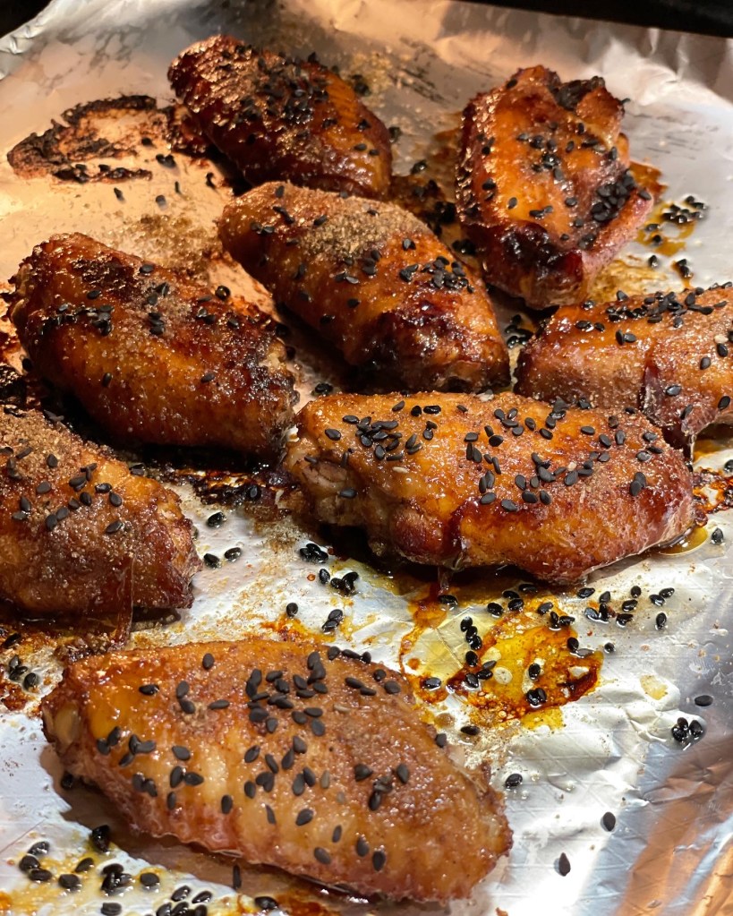 2) 焗爐預熱200度,先焗背面10分鐘,反轉雞翼灑上黑芝麻,再焗8分鐘,再在雞翼面灑上少許孜然粉調到228度焗2分鐘即成