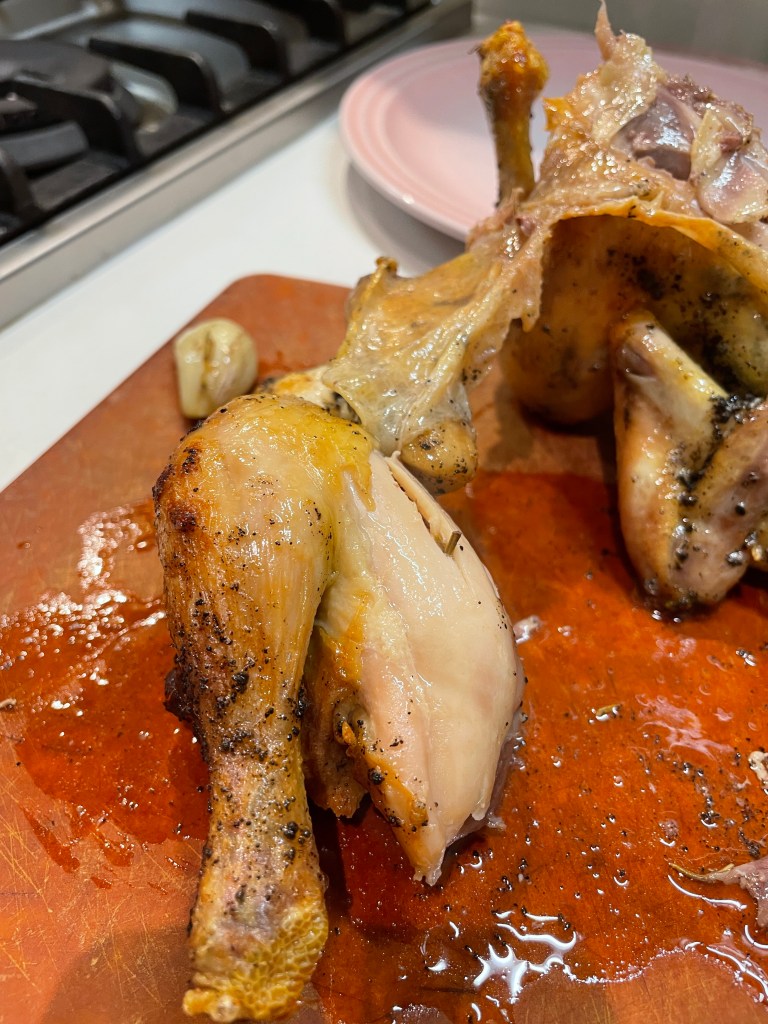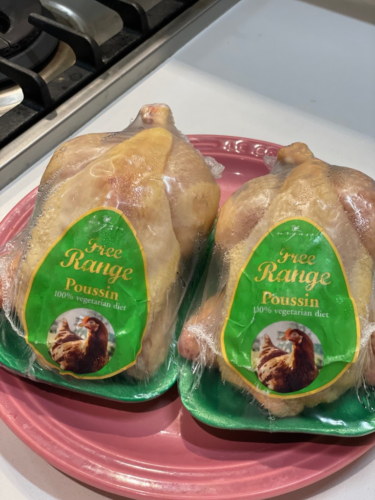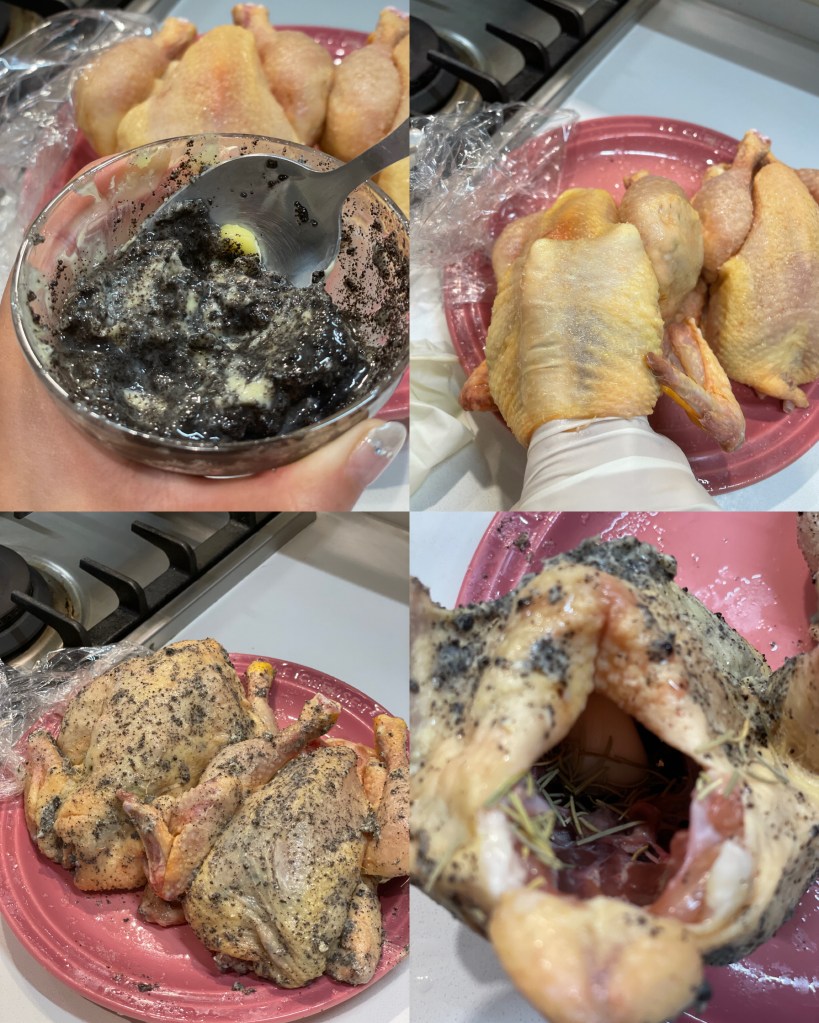 1) 早一晚把雞洗淨,用廚紙內外抹乾,1隻春雞表面先塗上1茶匙海鹽