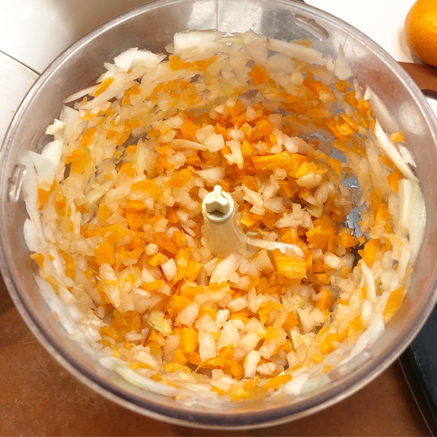 1) 洋蔥和甘荀切小粒,預熱焗爐200度