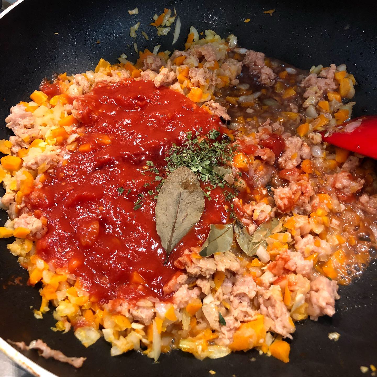 4) 加入月桂葉、香草、牛肉湯、茄汁、紅酒、糖、鹽及黑胡椒煮滾,然後轉小火煮20-30分鐘至濃稠,月桂葉拿走