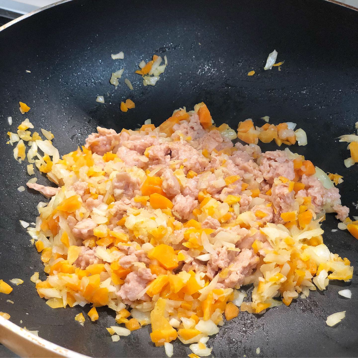 3) 落1湯匙牛油燒熱,加入洋蔥中火炒約2分鐘至透明軟身,再落甘荀及蒜蓉炒3分鐘,再落牛肉碎,不停炒約3分鐘至牛肉變色,再加入蕃茄粒炒勻