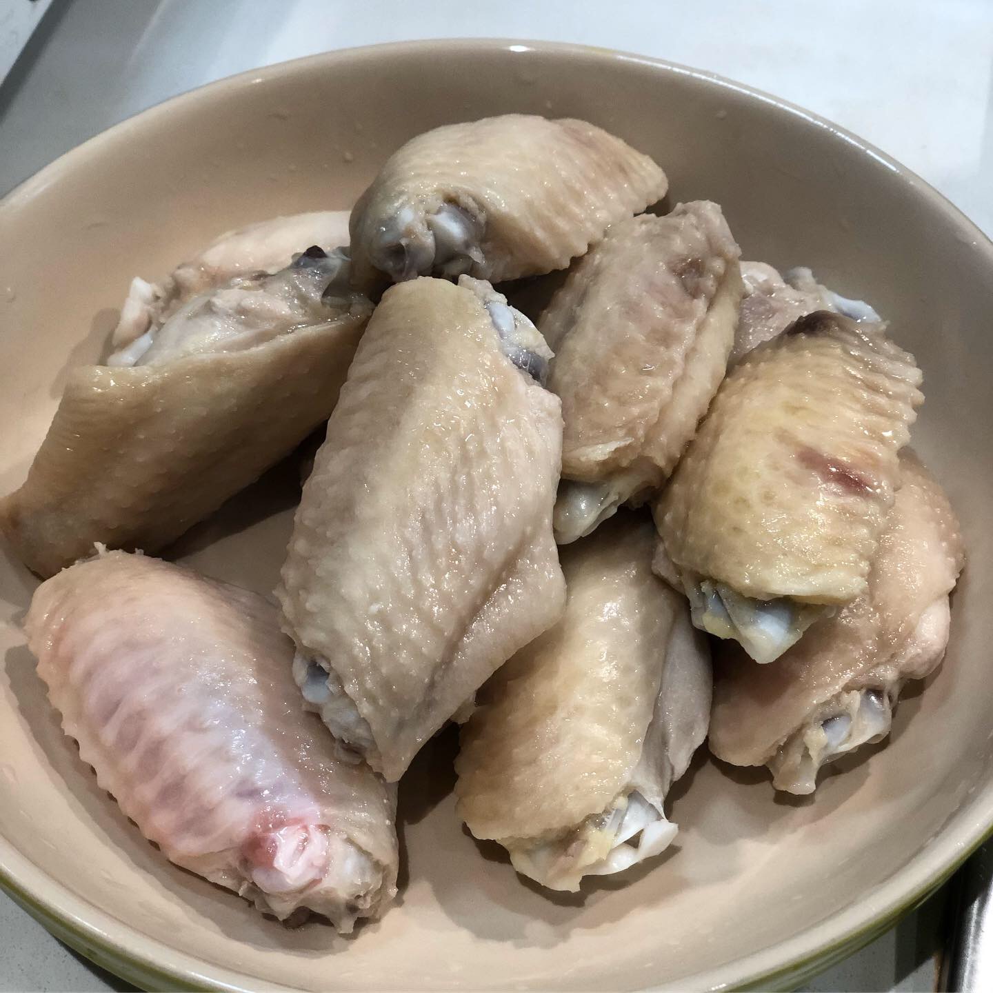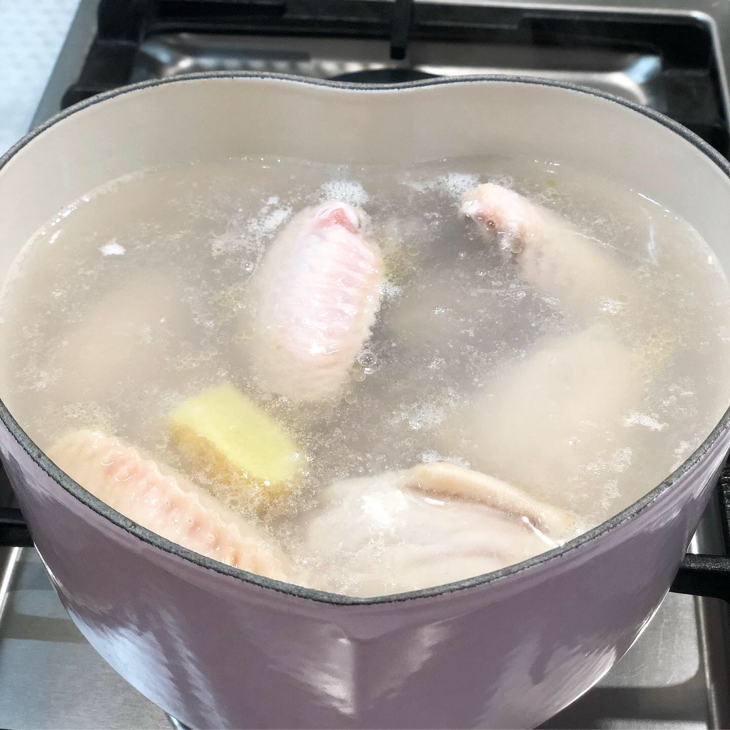 1) 雞翼及薑片放凍水開細火飛水,水小小滾起時要轉最小火~2分鐘,千萬不可以大滾,撈起瀝乾