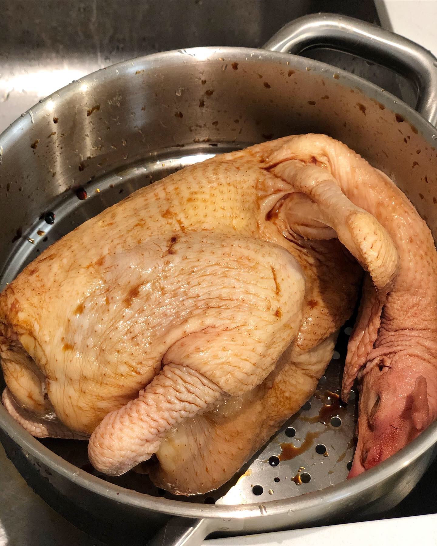 1) 雞洗淨抹乾,用老抽抹匀雞皮,吊至乾身(約1小時)