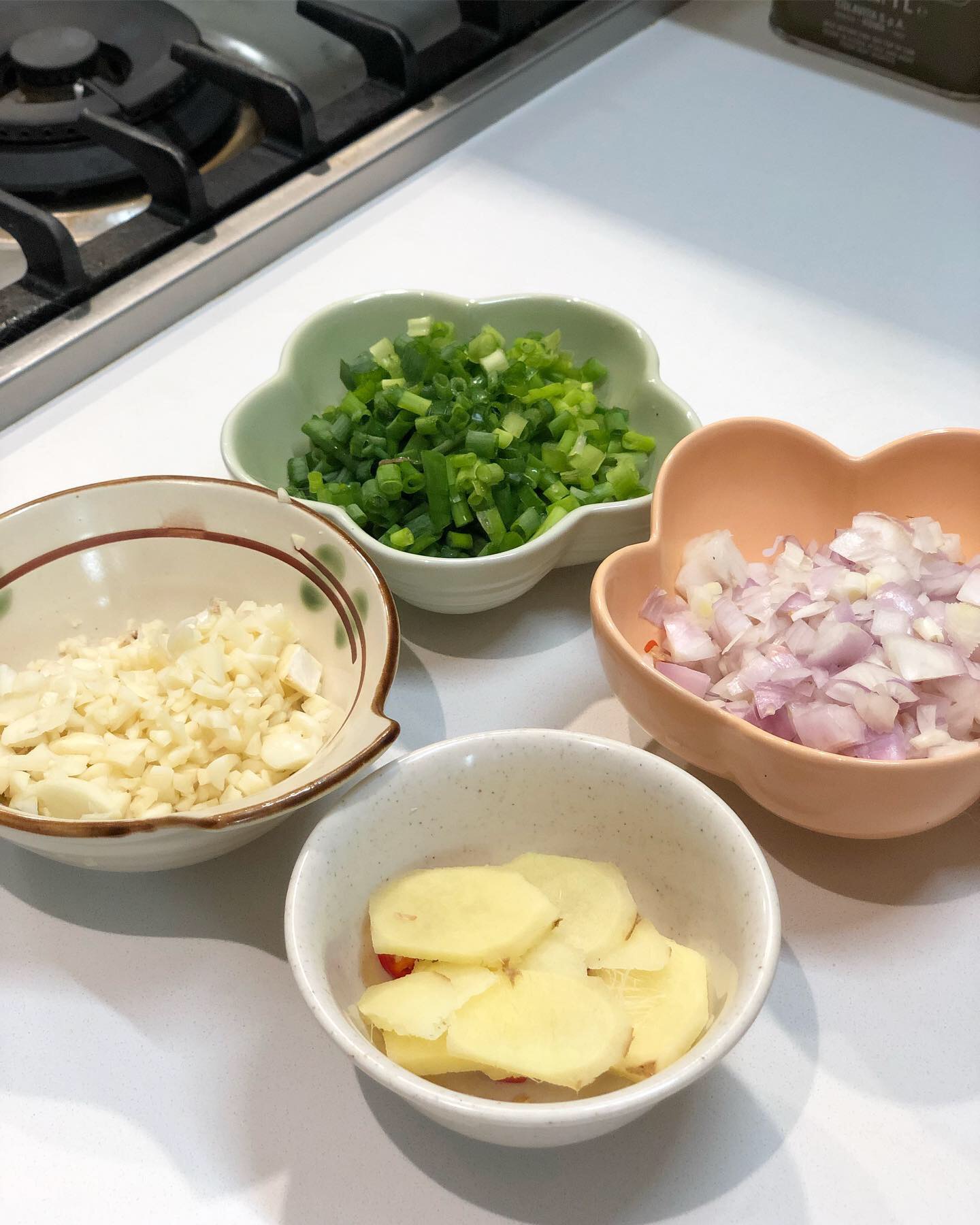 2) 大鍋中火下2湯匙油,放入薑片爆香,再加入蒜蓉及乾葱蓉爆香
