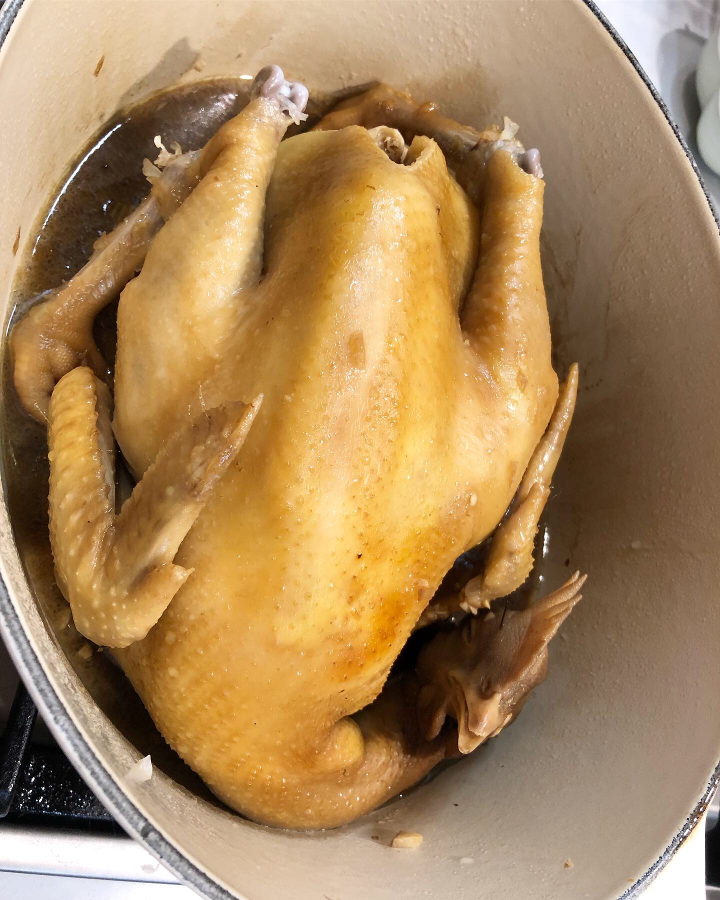 4) 把雞取出待涼斬件,雞斬件後放回鍋中