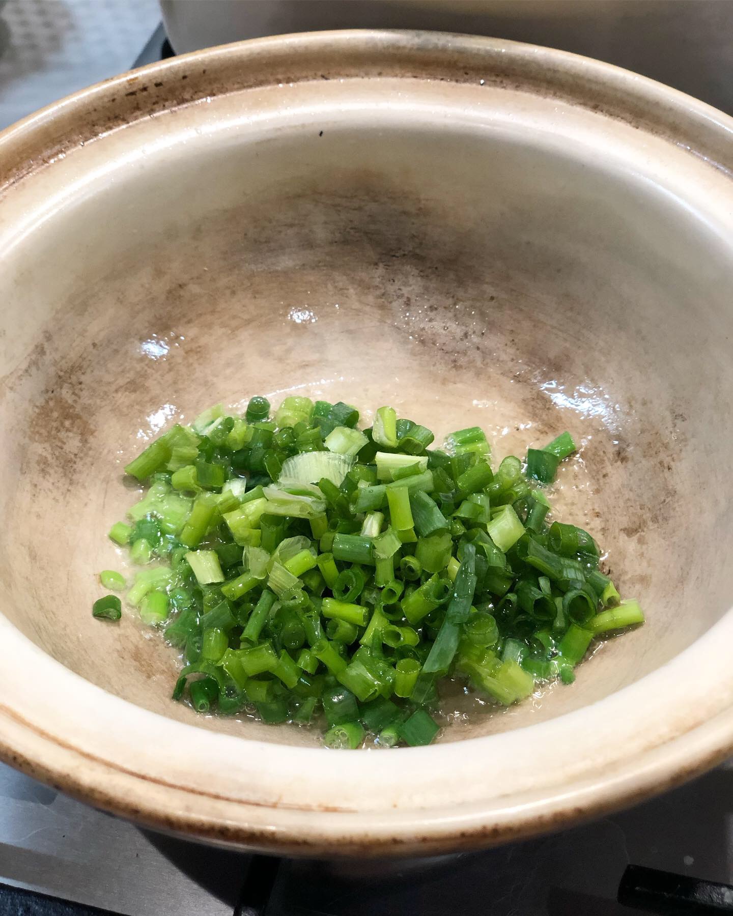 6) 在另一鍋中加熱2湯匙油,爆香葱粒,連油淋在雞上即成