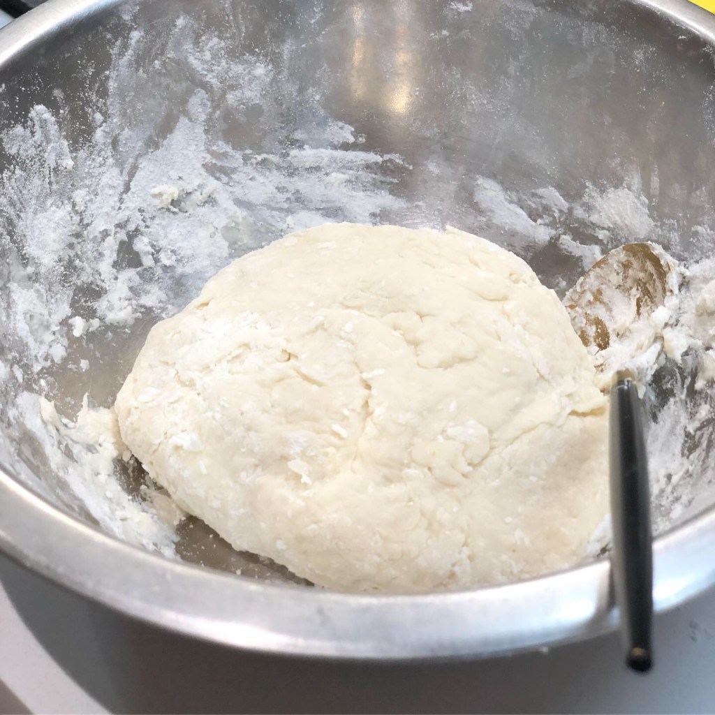 2) 中筋麵粉加滾水拌勻再加入冷水揉成麵糰,可用手揉至混合即可,不用完全光滑,讓麵團靜置三十分鐘