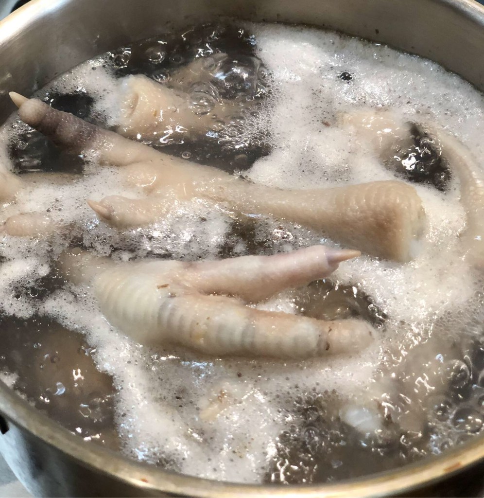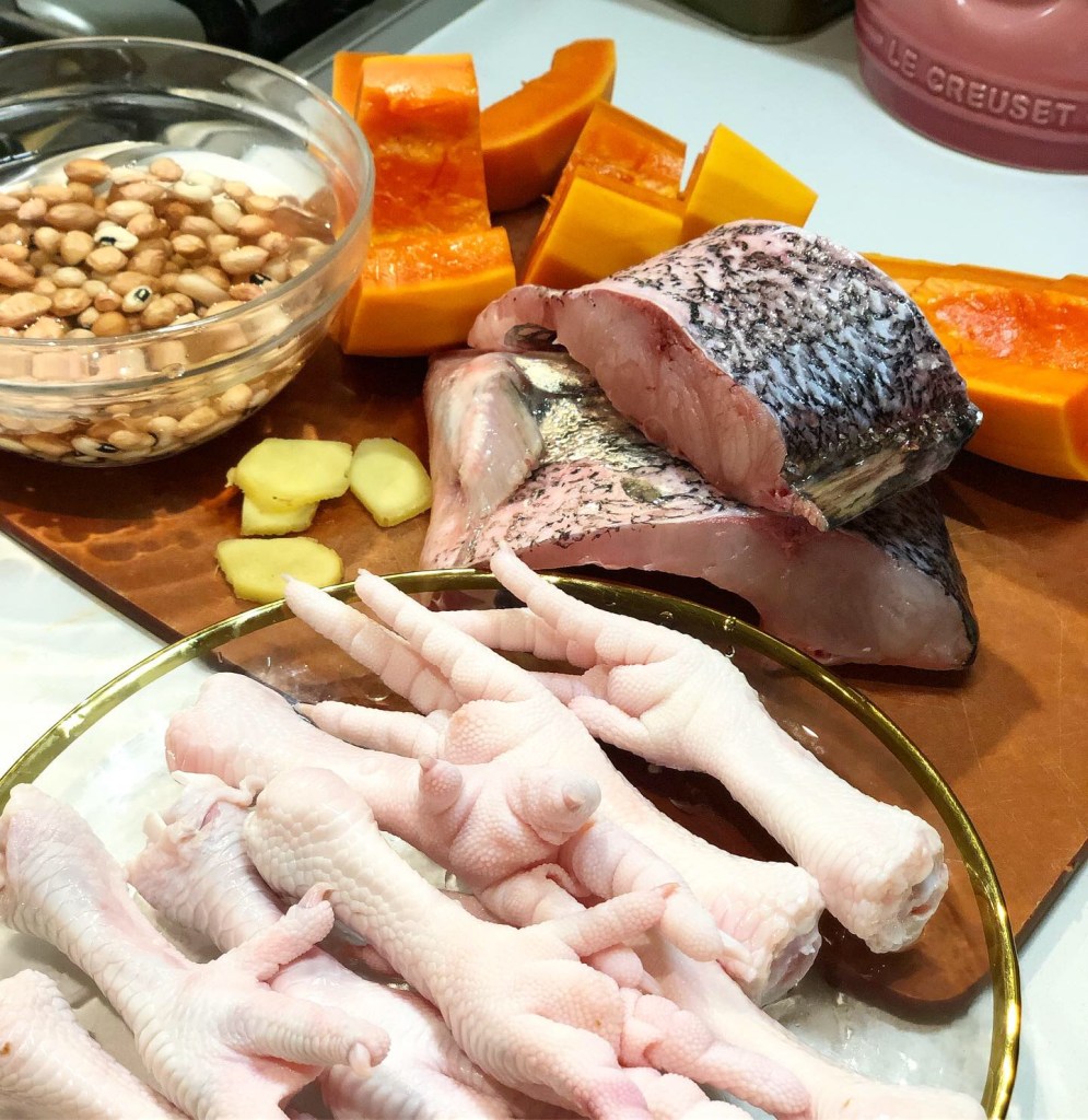 雞腳蘊含豐富的膠質, 對皮膚和筋骨的保養尤其有效,配花生一同食用,能有效強健筋骨,是廉價的健脾益胃湯水。不過我個日街市的大魚尾已經無哂,用咗其他部位呢,個湯好甜好充滿膠質。