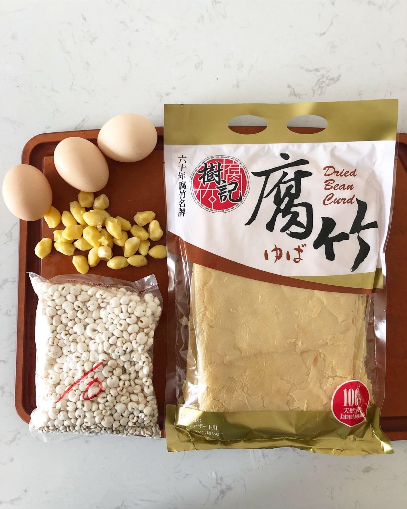 1) 白果去穀,用熱水浸15分鐘,去皮剔芯,薏米洗淨待用水浸半小時,腐竹用水浸一會