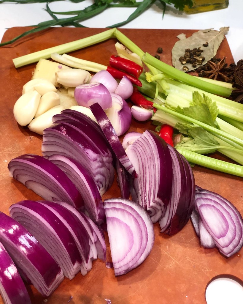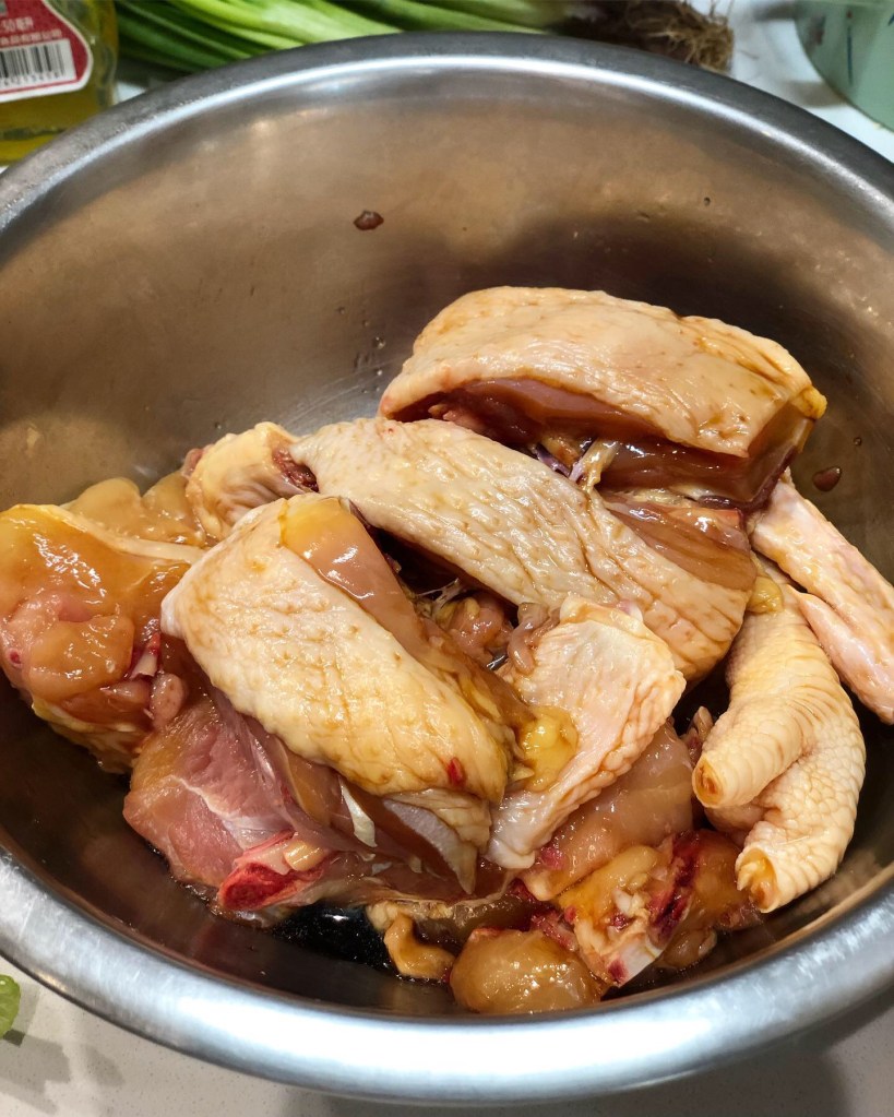 1) 雞件加入醃料拌勻醃15分鐘,略拍薑、乾蔥和蒜頭 ,蔥切、唐芹和指天椒切段,紫洋蔥切塊