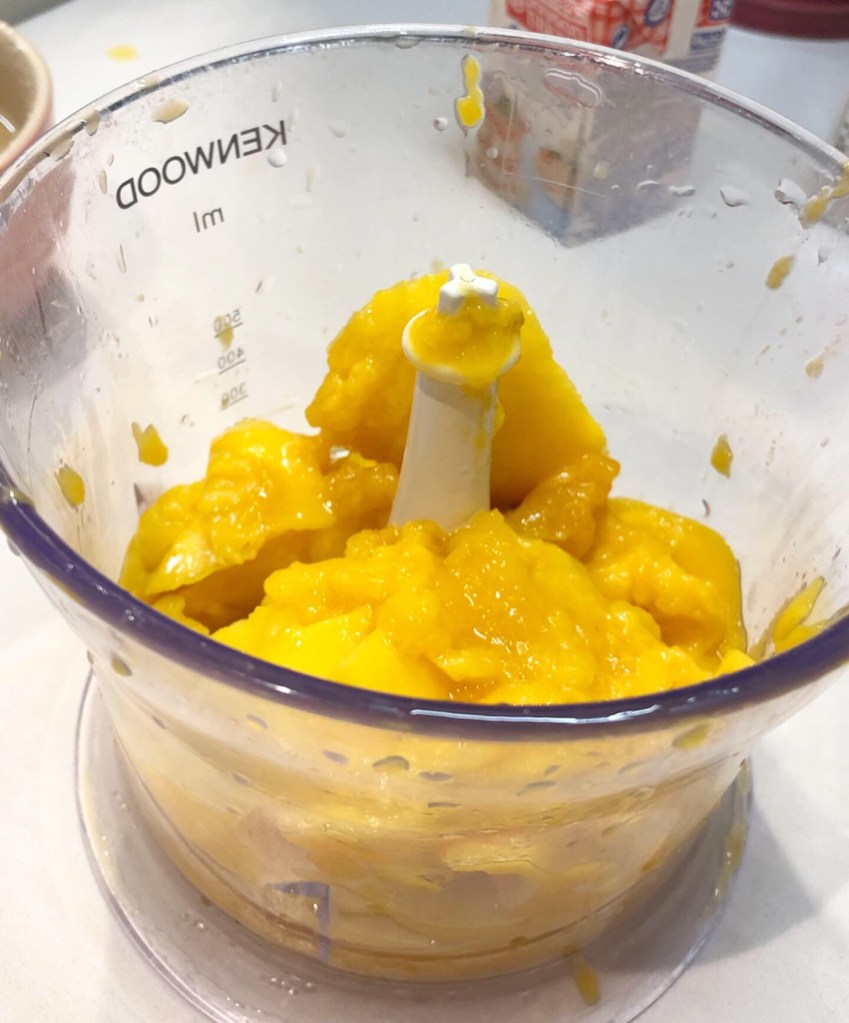 1) 2.5個芒果去皮刮出果肉,放入電動攪拌機打成芒果茸,餘下的0.5個切粒備用