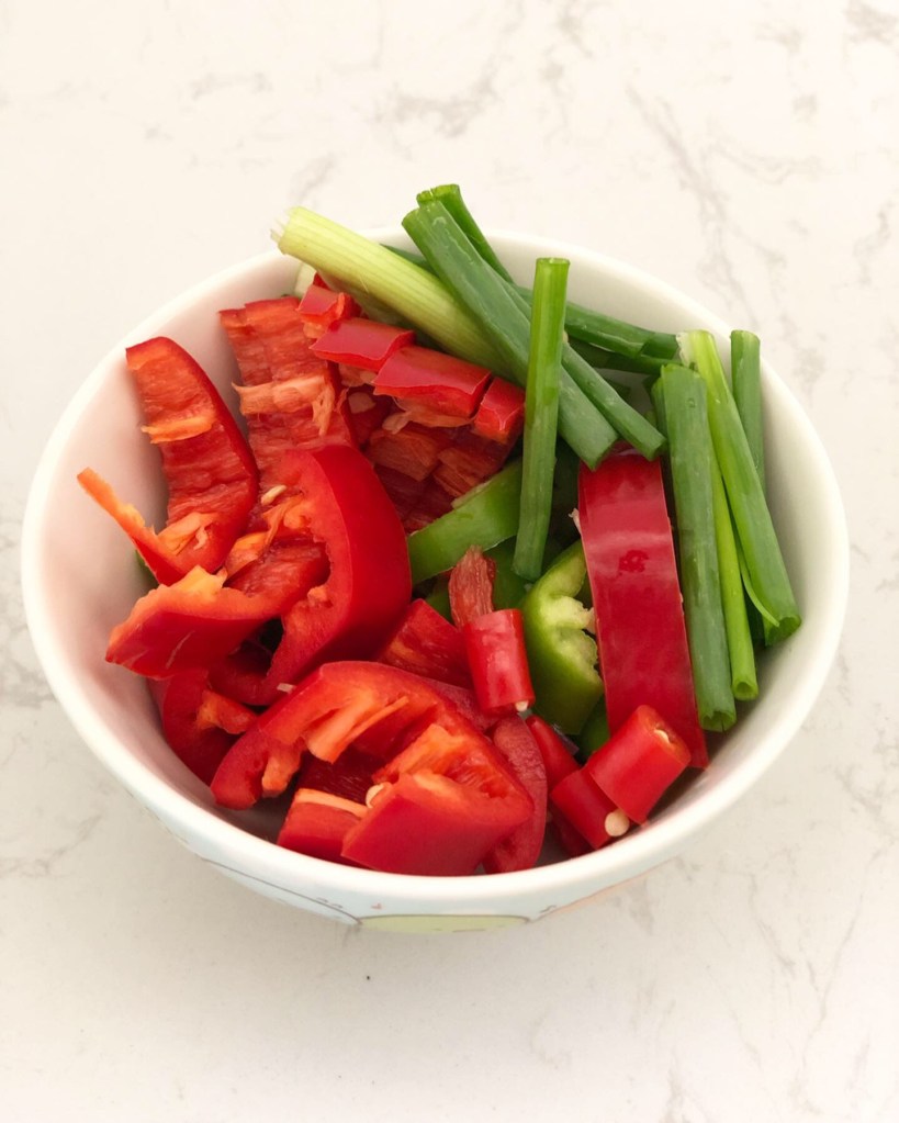 2) 中火燒熱油鑊,加辣椒、紅尖椒及青尖椒爆香1分鐘