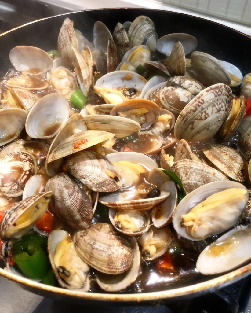 3) 然後下蜆炒至半開,灒米酒,繼續炒20秒,下調味料炒勻,炒至蜆殼全開,下生粉水打獻,再拌入蔥段即成