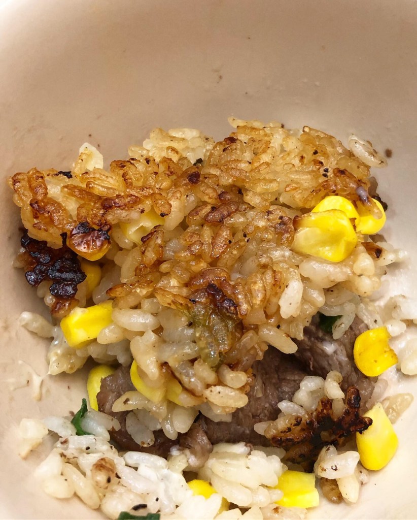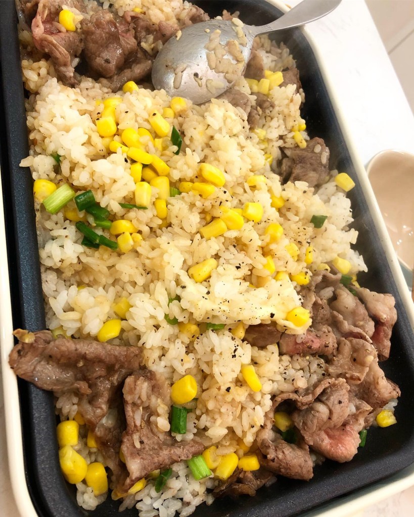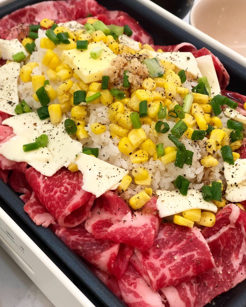 2) 鐵板上先放一半牛油在中間,再倒上適量燒肉汁,再鋪上白飯,旁邊鋪上牛肉,飯上放上粟米、芝士、黑椒、蒜蓉、葱花、牛油和燒肉汁
