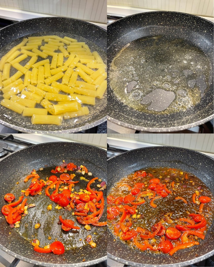 1) 燒滾熱水加1湯匙鹽,意大利粉按包裝指示減2分鐘來煮至Al Dente質感