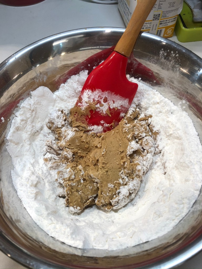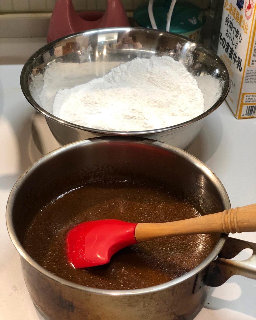 4) 逐少加入放涼了的黑糖薑汁,一面攪拌直至濃稠無粉粒