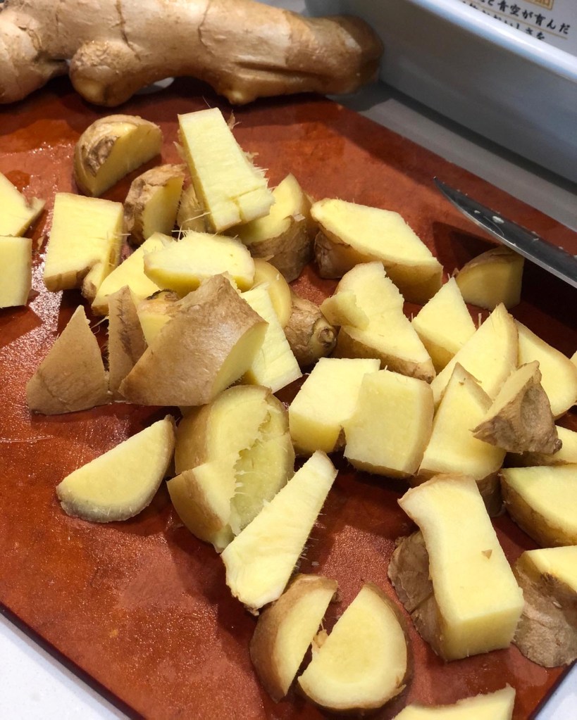 1) 薑用水沖洗抹乾,連皮切大粒,加水4-5湯匙水放入攪拌機,打成薑蓉, 放進魚袋壓出220g薑汁