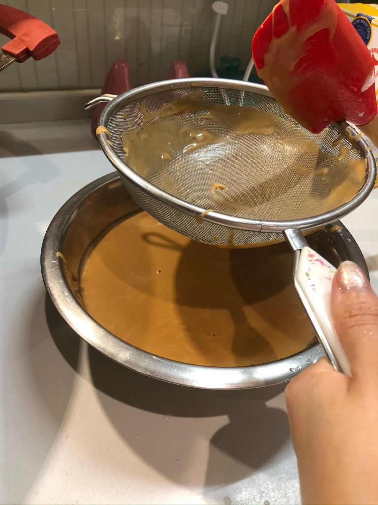 5) 蒸盤塗油,將粉漿過篩倒入,蒸盤蓋上錫紙包好,中大火隔水蒸1.5-2小時,用竹籤插入糕身,沒有粉漿黏著表示已熟