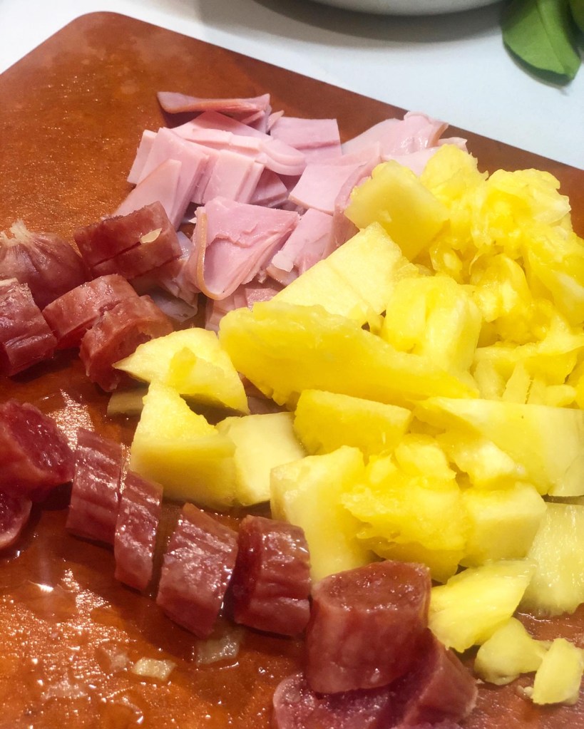 2) 菠蘿肉、臘腸、火腿、雞肉切粒