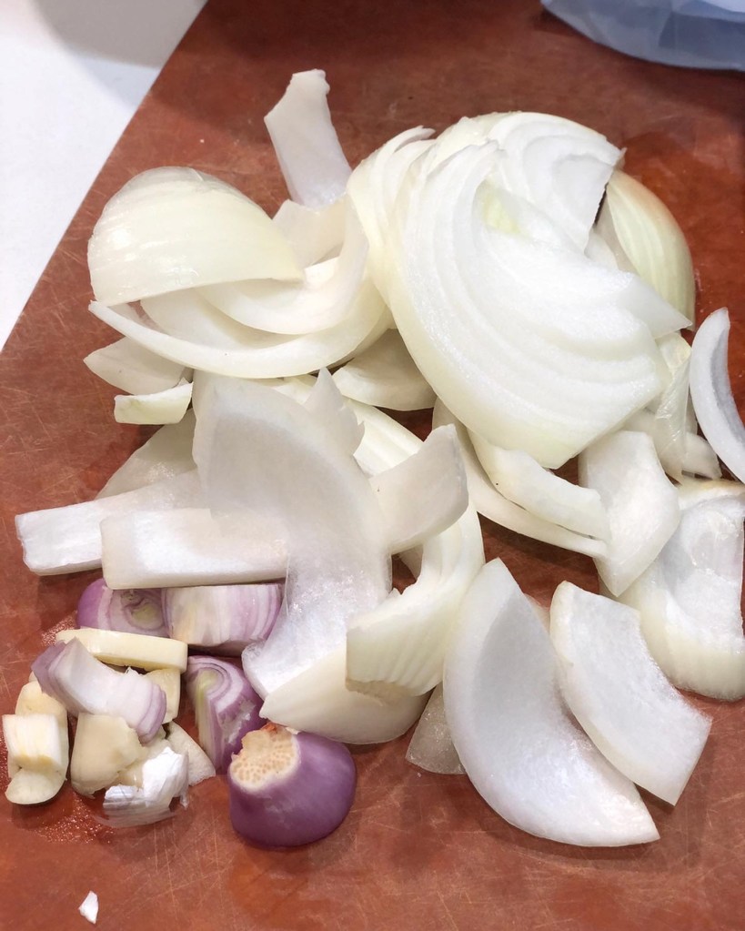 1) 洋蔥和乾蒽切粒,栗子放熱水浸一會去殼去衣