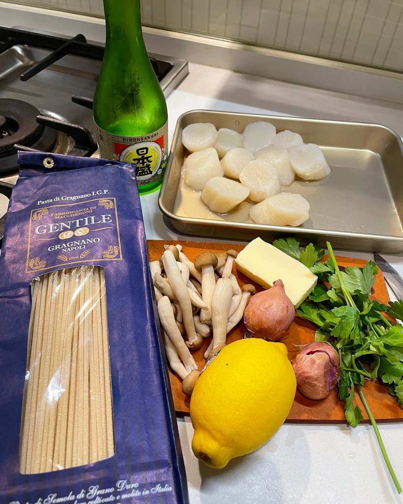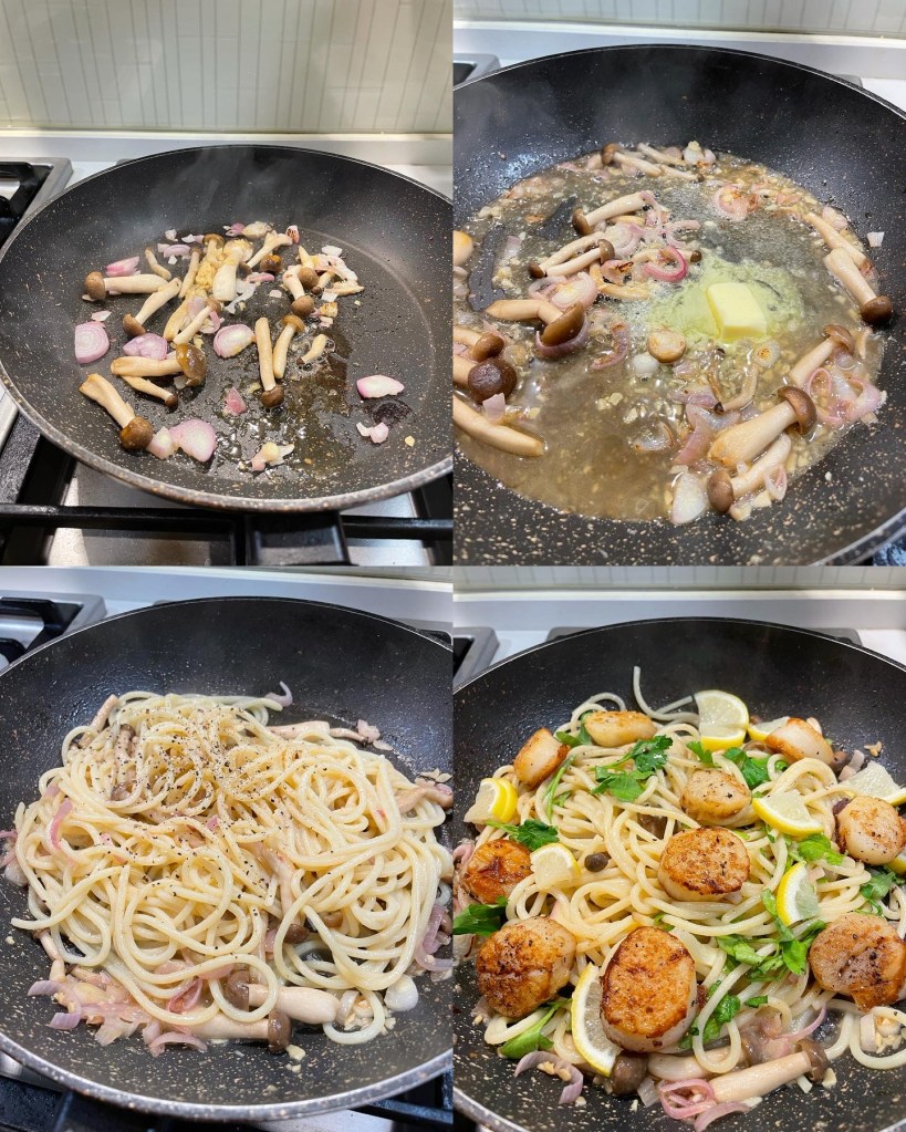 4) 熱鑊下10g牛油爆香蒜蓉、乾蔥蓉和本菇,倒入清酒煮至酒味蒸發,再加入10g牛油、檸檬汁和意粉煮至汁濃