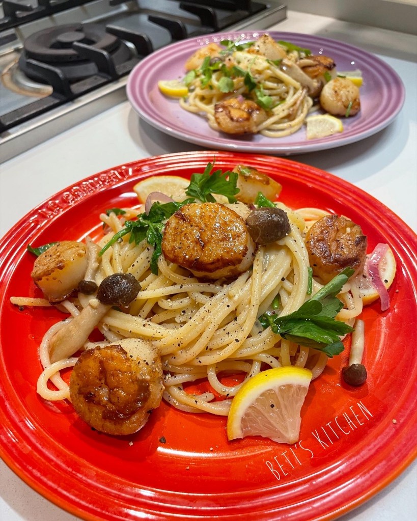 5) 加入扇貝,下少許鹽調味,加parsley和檸檬片裝飾即成