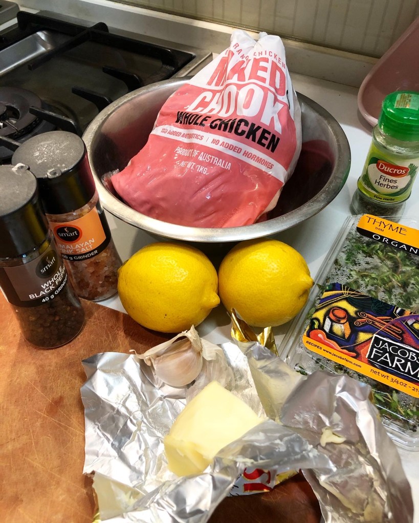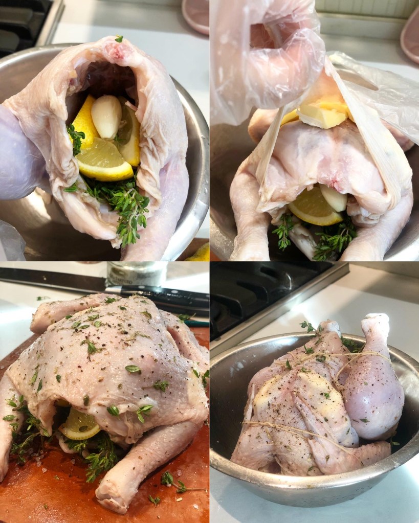 1)把雞洗淨,用廚紙內外抹乾,雞內塗上少少橄欖油,再將檸檬切角,蒜頭壓扁,和6扎thyme放入雞內