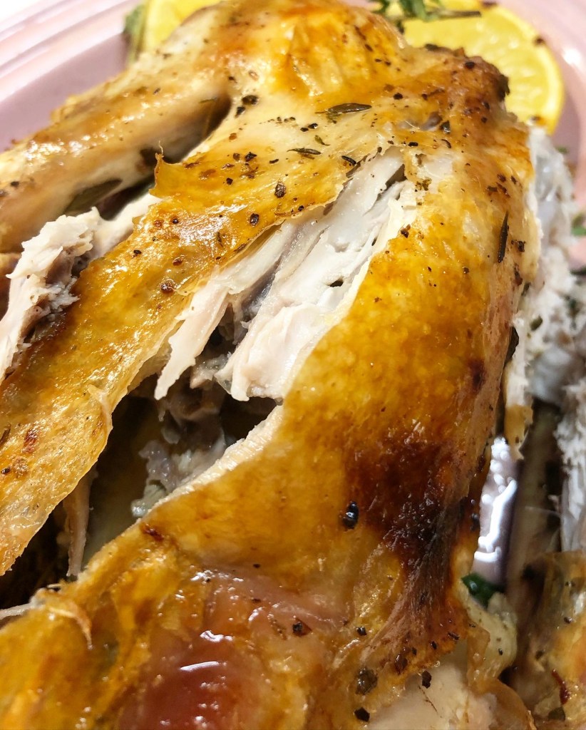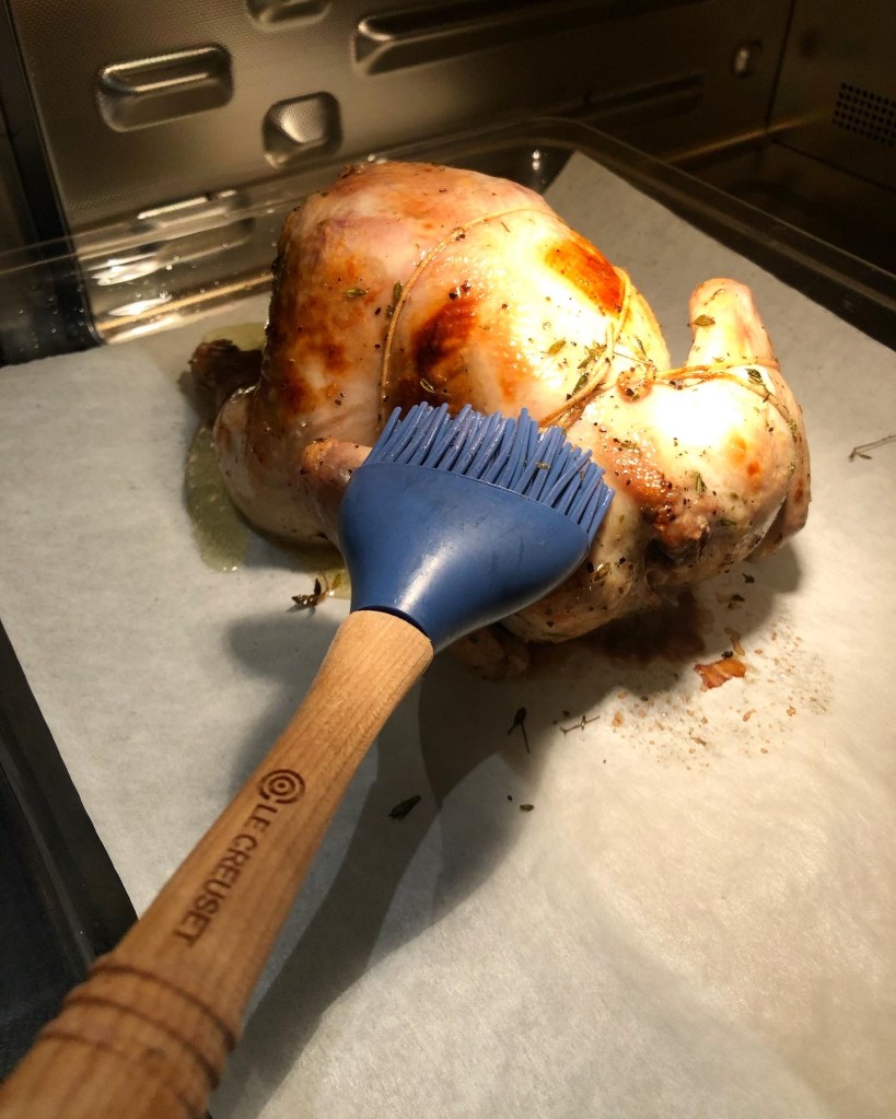 5) 把焗爐預熱至攝氏150度烤40分鐘,中途掉轉雞身兩次令烤色更均勻,再轉攝氏240度烤15分鐘烤脆雞皮