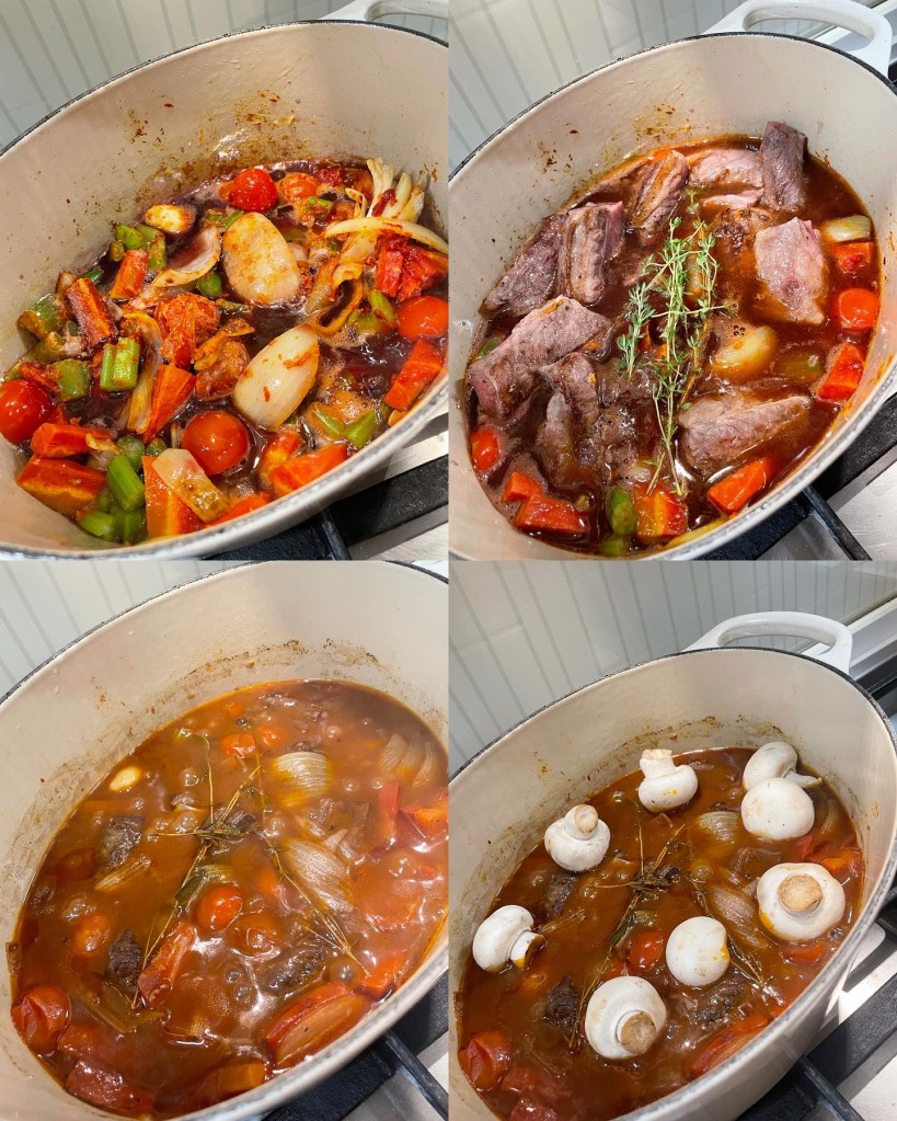 4) 加入茄膏炒勻,再下麵粉拌勻,加入牛肋條,倒入牛湯、紅酒、thyme和Bay Leaf,大火煮滾後加入鹽和黑椒,轉小火蓋上蓋炆1.5-2小時,最後10分鐘加入蘑菇