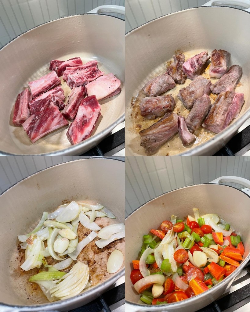 1) 牛肋條解凍後切成塊,加鹽和黑椒醃十分鐘,洋蔥切條,車厘茄切半,甘荀和西芹切塊