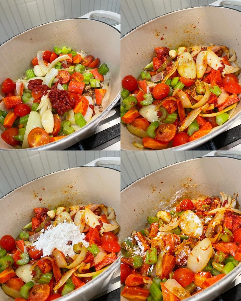 3) 同一個鍋中,(如太多油可倒一倒,不用洗) 用牛油細火炒香洋蔥,再加入蒜頭炒香,再加入車厘茄、甘荀和西芹炒勻