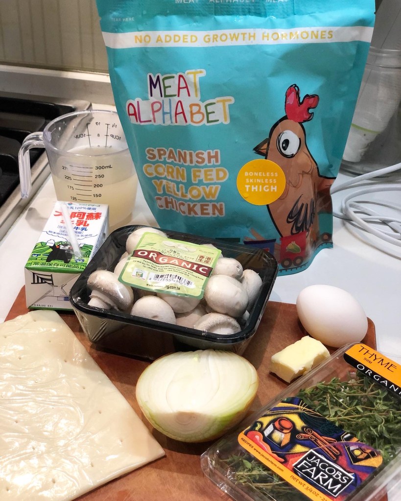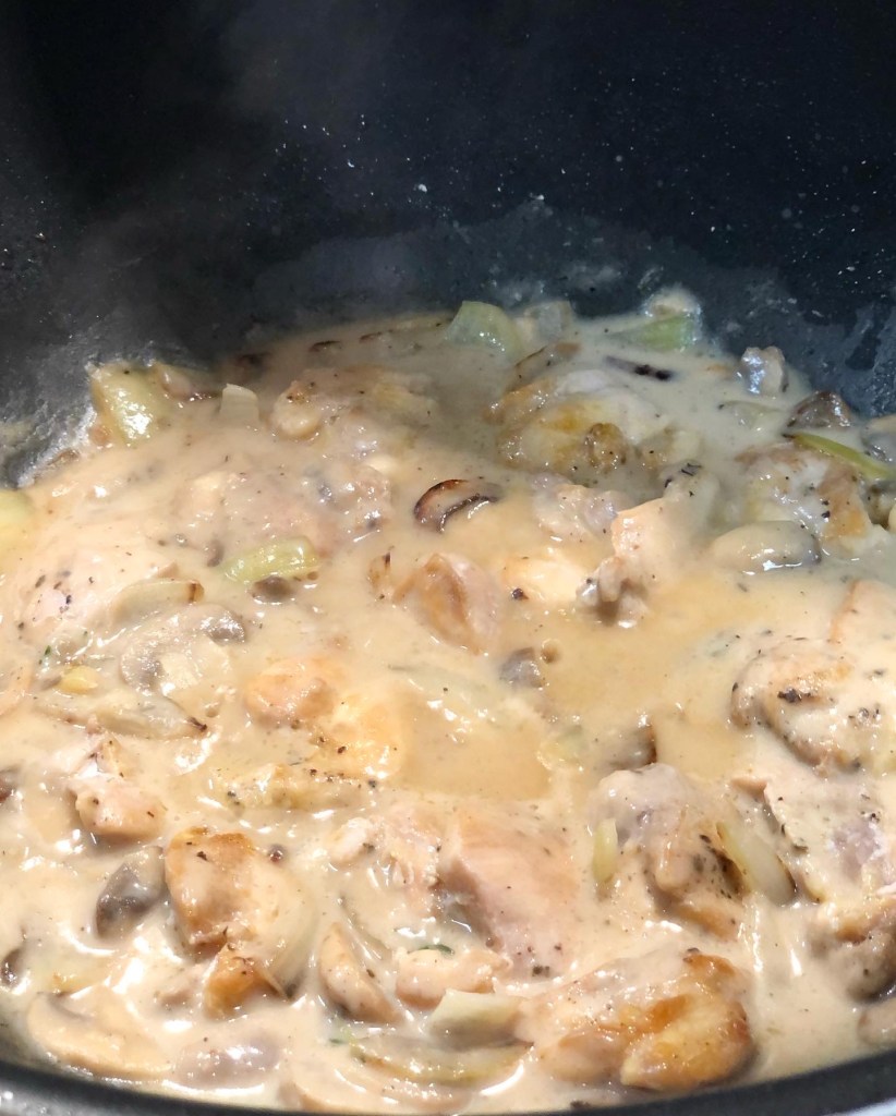 4) 熱鑊下牛油把洋蔥和蘑菇炒香,約3分鐘,然後再加入麵粉炒勻,再慢慢加入thyme、雞湯和牛奶,煮滾後把雞腿肉加入,然後轉細火繼續煮15至20至分鐘,加鹽和黑椒調味