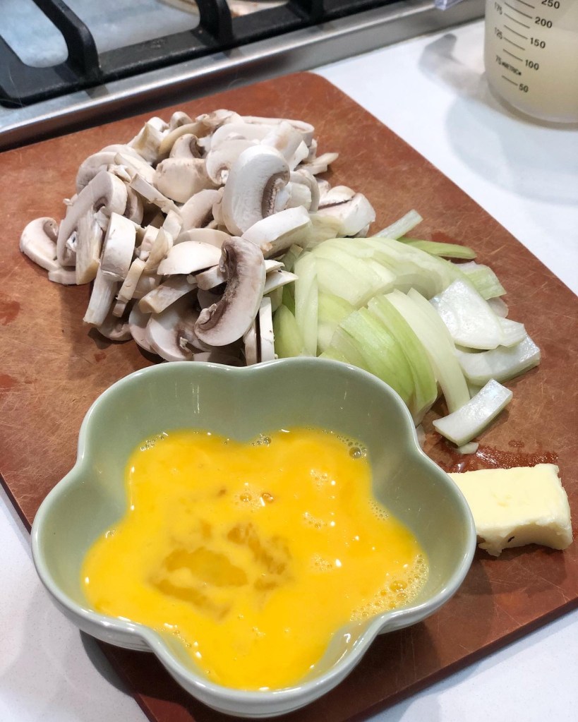 2) 蘑菇切片,洋蔥切條,雞蛋打發好
