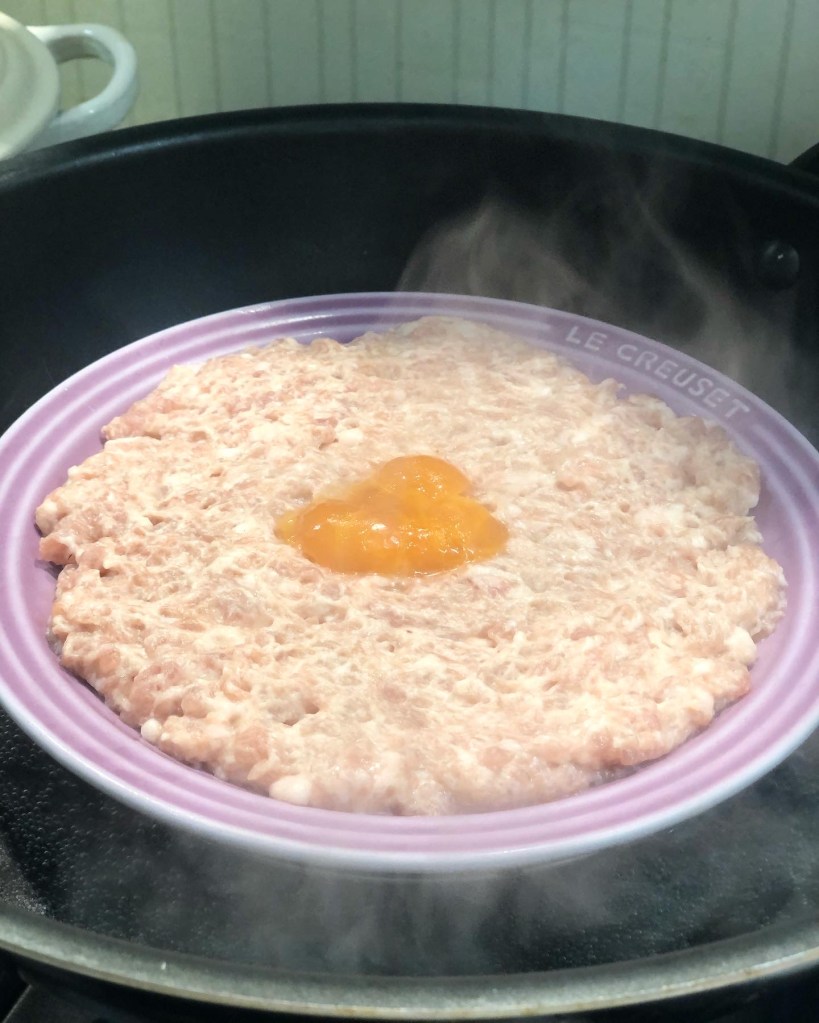 2) 把肉放在碟上,再加上咸蛋黃,可輕輕壓平鹹蛋黃,大火蒸10分鐘,最後再加上蔥花即成!鍾意重味啲可以再加上熟油和豉油!