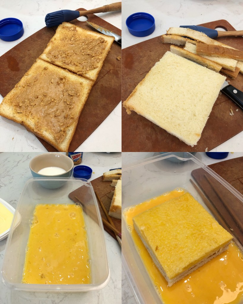 1) 在兩片方包上搽上花生醬,夾在一起,然後切開四邊包皮