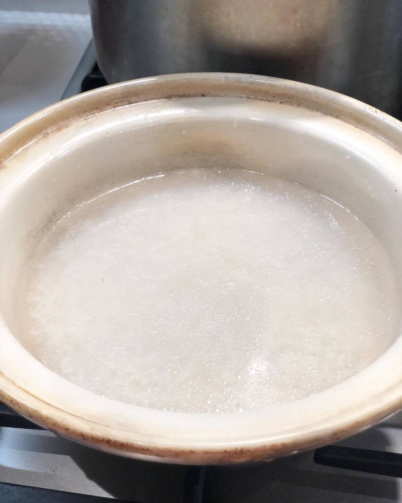 2) 蓋上鍋蓋以中小火煮至鍋蓋緣有蒸汽冒出,將臘腸臘肉鋪在飯面上中火煮5分鐘,再放上冬菇轉小火煮15分鐘,將火加大30秒,再熄火繼續焗約10分鐘 (其間不要打開蓋),再開小火煮5分鐘便可有飯焦 (如果仲未有就可以大火少少繼續煮)