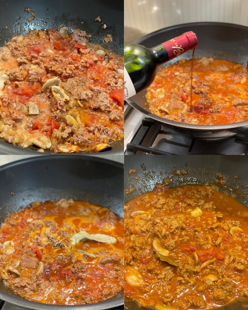 3) 加入月桂葉、香草、vegetable soup、茄汁、紅酒、糖、鹽及黑胡椒煮滾,然後轉小火煮15-20分鐘至濃稠,月桂葉拿走