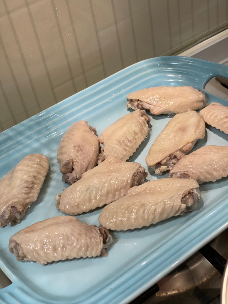 1) 將浸雞翼材料煲滾後加入雞翼,用慢火煮10分鐘,然後關火浸5分鐘,放到冰水浸15分鐘備用