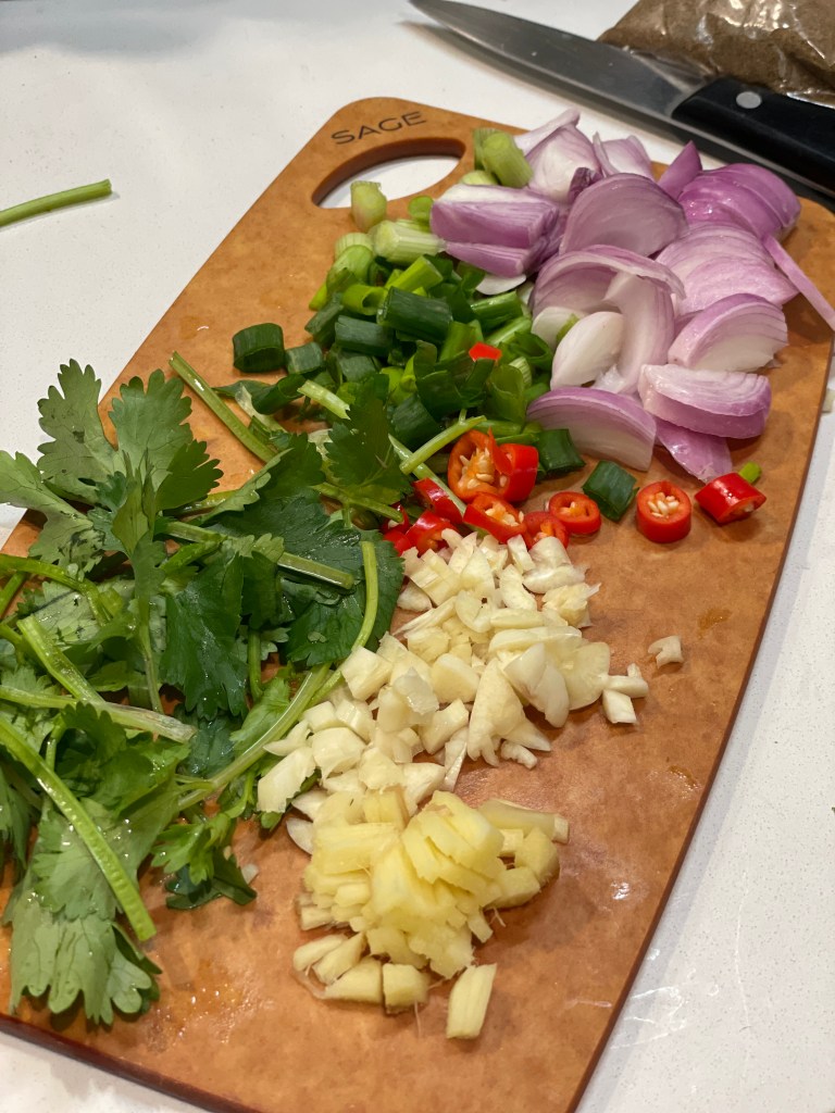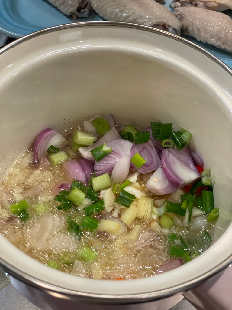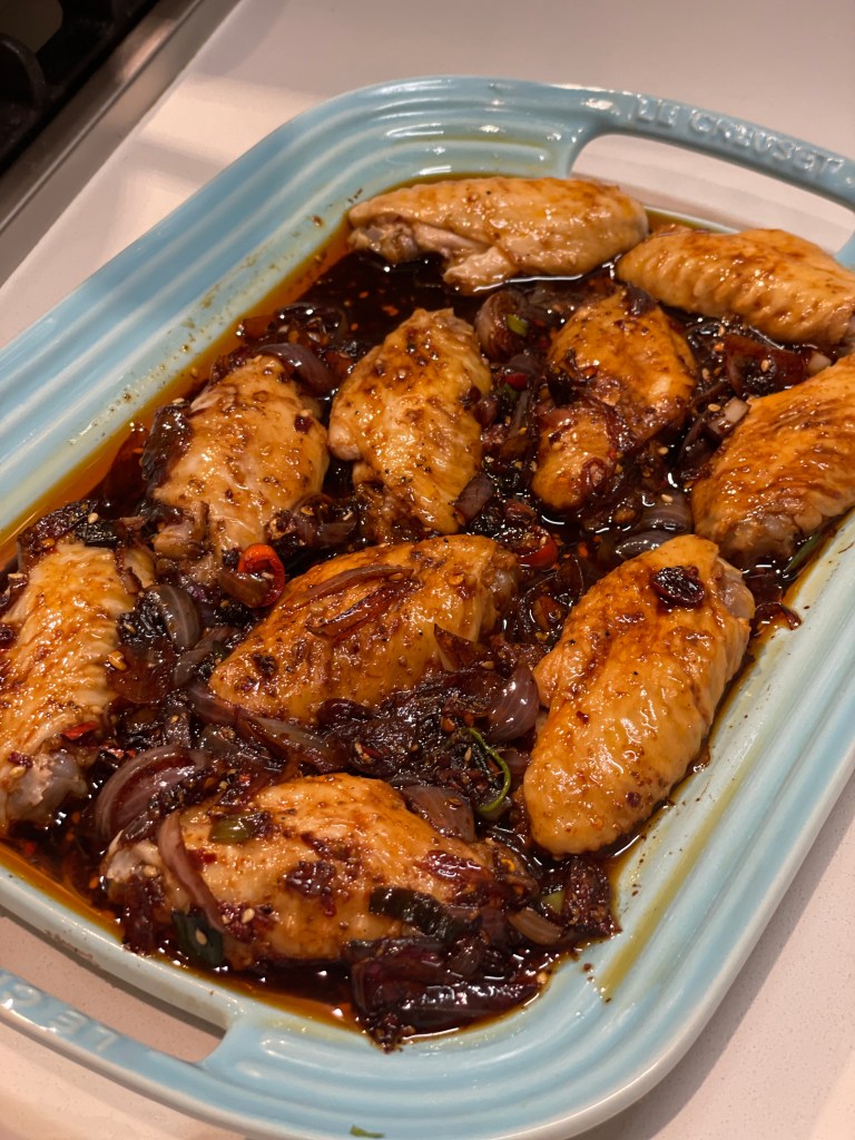 2) 煮熟油後關火,立刻下薑蓉、蒜蓉、蔥花、乾蔥、指天椒炒一下,再下其他麻辣汁材料拌勻試味,麻和辣的程度可依個人口味增減、麻辣醬淋上雞翼上!