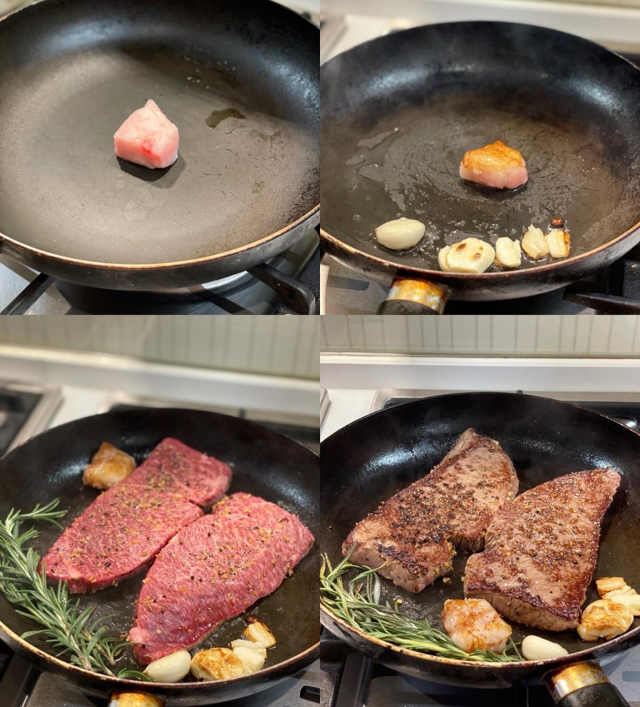2) 大火下油,加入蒜頭和Rosemary放在一邊 (出味用),再下牛扒煎好一邊,之後加入牛油,翻去第二邊再煎至自己喜歡的熟度!切忌翻來翻去!