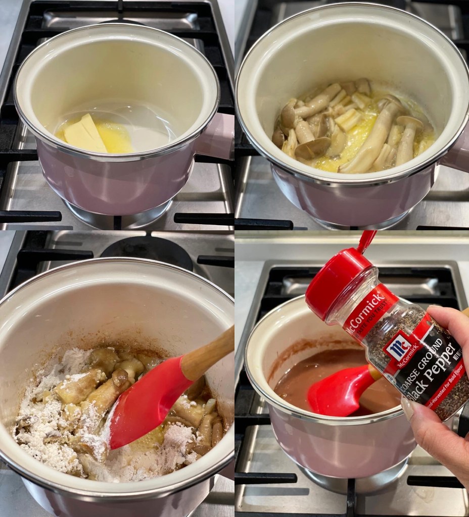 1) 蘑菇切片,熱鍋下牛油,把蘑菇炒5分鐘,加入蒜蓉炒1分鐘,加入麵粉,攪拌均勻,再倒入高湯和紅酒,煮滾後轉細火,加入調味料,汁煮至濃厚即成