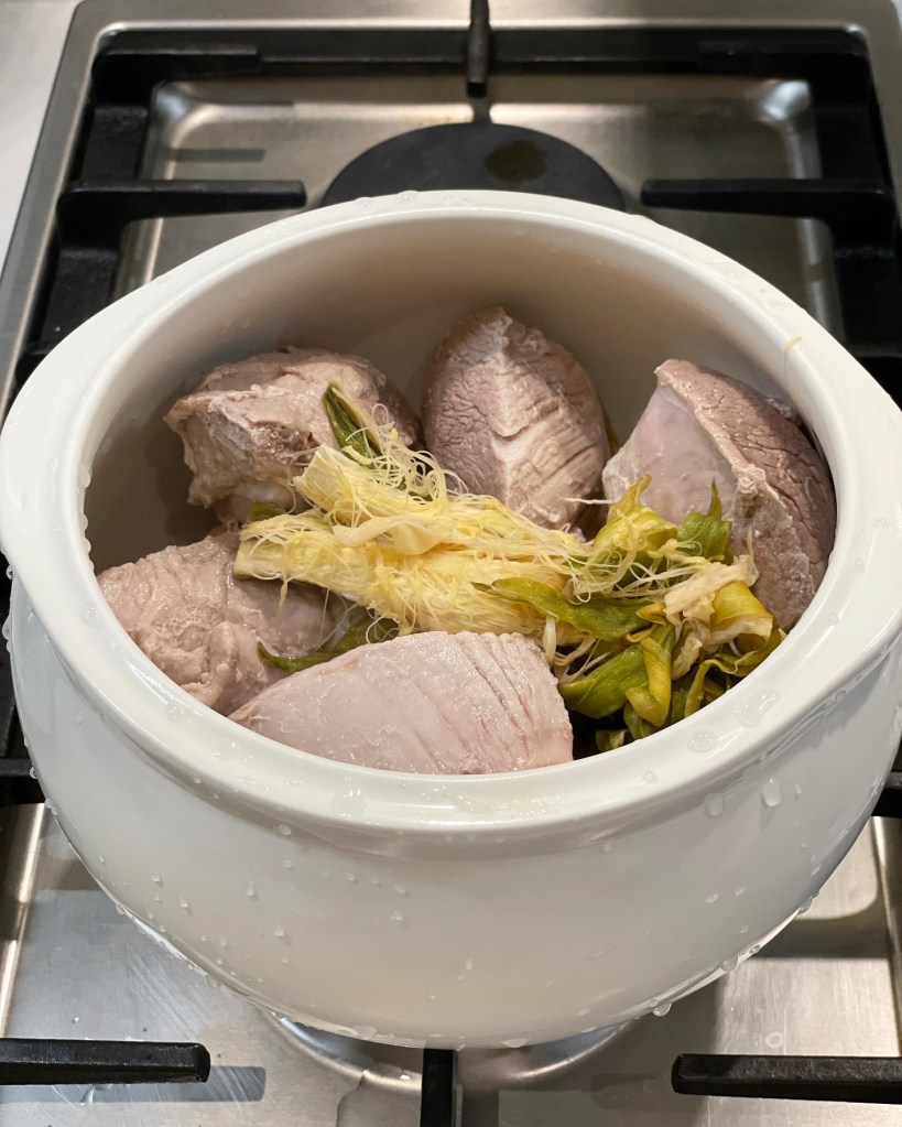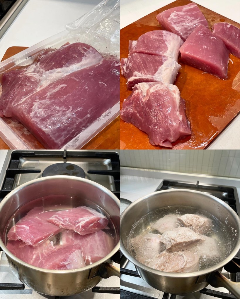 2) 豬𦟌切大塊後汆水去除污糟物(即是凍水下豬𦟌,水滾後繼續煮5分鐘拿出),之後用水輕輕洗淨備用