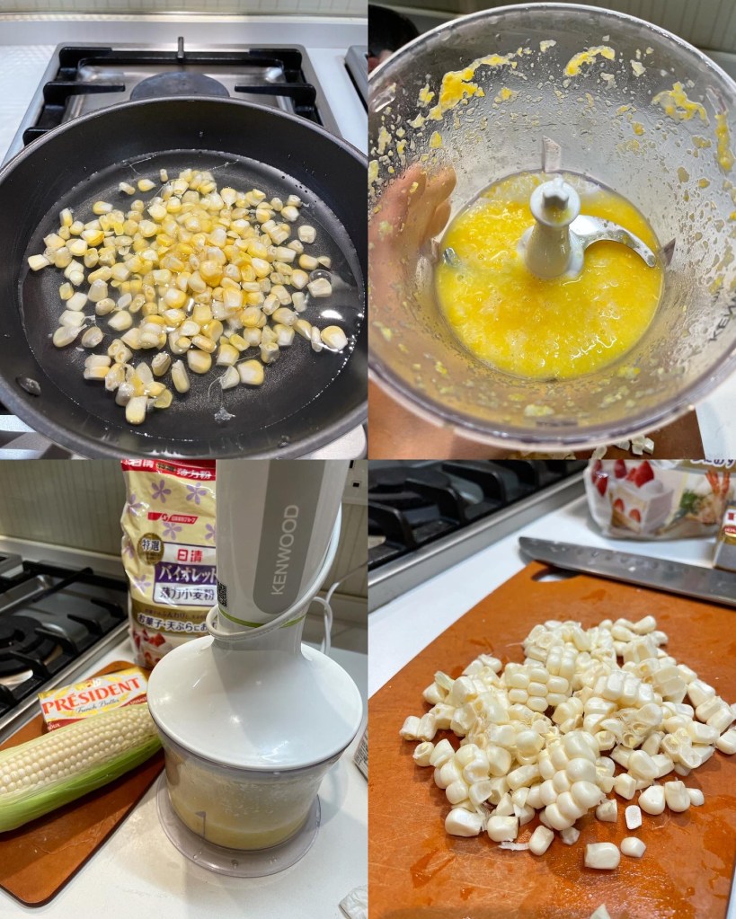 2) 粟米切出來,黃色粟米粒加適量水份煮熟,隔走水份,再放入3湯匙水放入攪拌器打碎,成粟米蓉 (可用罐頭忌廉粟米取代)