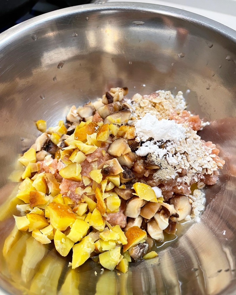 2. 水、吉士粉、木薯粉和砂糖拌勻!加入無鹽牛油!用細火煮至微滾!熄火!加入咸蛋黃碎!攪拌均勻!