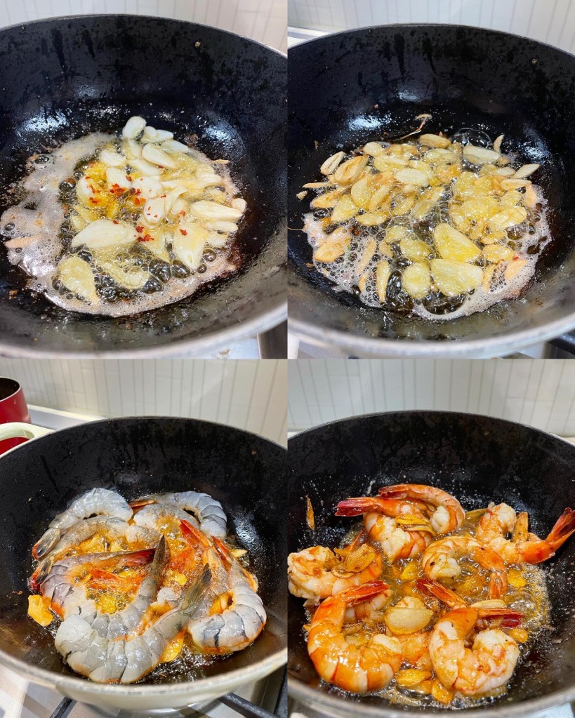 1. 蝦去殼去腸,留尾和剪去蝦頭,蝦頭備用!蒜頭切片!
