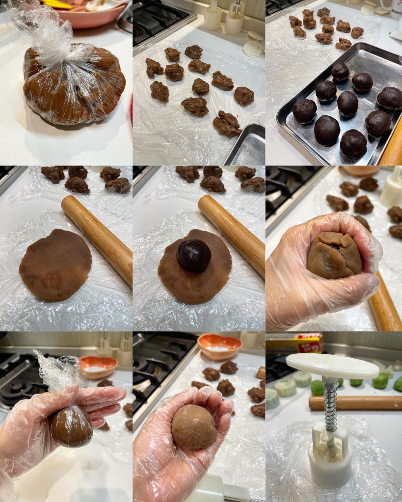 6. 蒸好後用刮刀刮起,待涼後分成20g!保鮮紙墊向上下,再用麵粉棍桿出比餡大大少少的外皮!之後就可以移開上層保鮮紙,再放入餡,可以用保鮮紙幫手收口定形!收得唔靚問題不大,之後壓模可以修正
